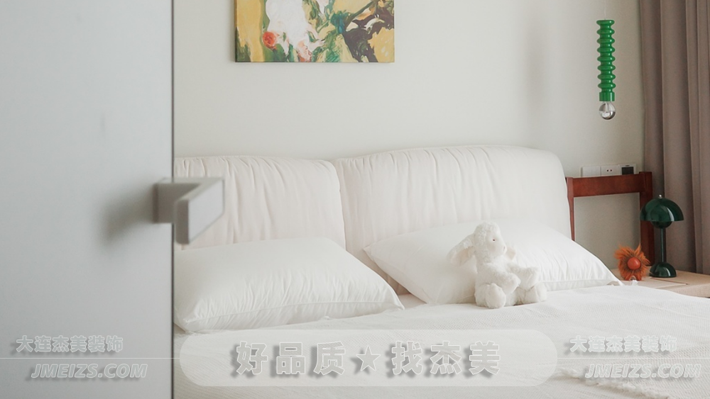 床上的寢具與墻面的柔和色調(diào)相映成趣,溫暖而安心。大面積的留白使得睡眠環(huán)境充滿自然的韻律,仿佛置身于森林的懷抱中。